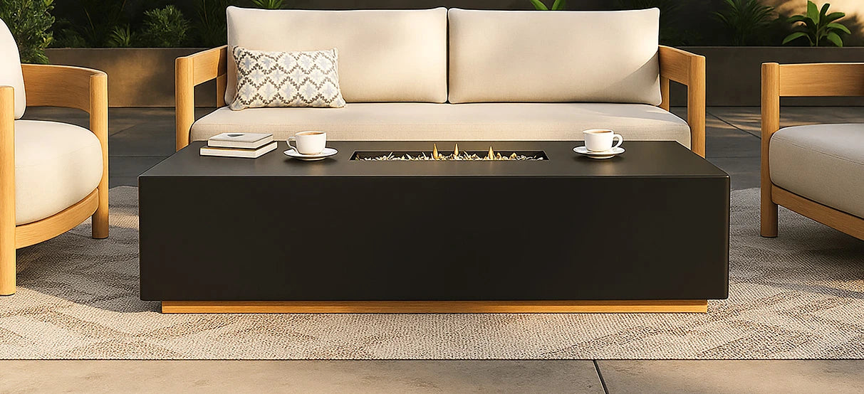 CRAFTED WITH THE SAME SIGNATURE LUXURY AS THE LUXXE DAYBED, IT FEATURES A ROBUST ALUMINIUM FRAME AND PREMIUM MATERIALS LIKE NATURAL STONE OR TEAK ACCENTS, BUILT TO WITHSTAND THE GULF CLIMATE. PERFECT FOR EXTENDING YOUR OUTDOOR LIVING INTO THE COOLER EVENINGS, THE LUXXE FIRE TABLE CREATES AN ATMOSPHERE OF UNSURPASSED AMBIANCE AND SOPHISTICATED COMFORT FOR YOUR TERRACE OR POOLSIDE.